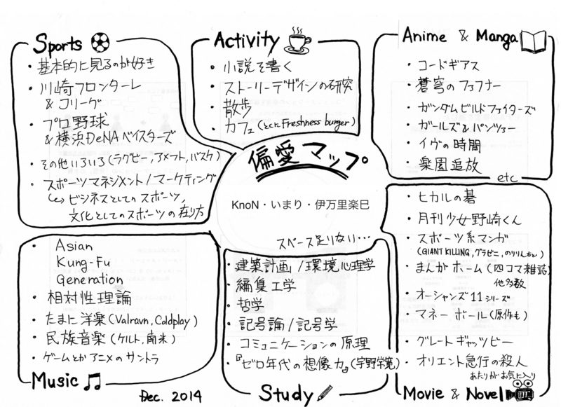 1枚の紙(A4のペーパー)に、自分の偏愛するものをキーワード方式に書いたもの(マップ)。書き方は、「くもの巣型」、「ジャンル型」、「時代型」などあるが、形式は自由。お互いマップを交換しながら会話をする。すると、癖のある人間が急に魅力的に思えてくるから不思議。